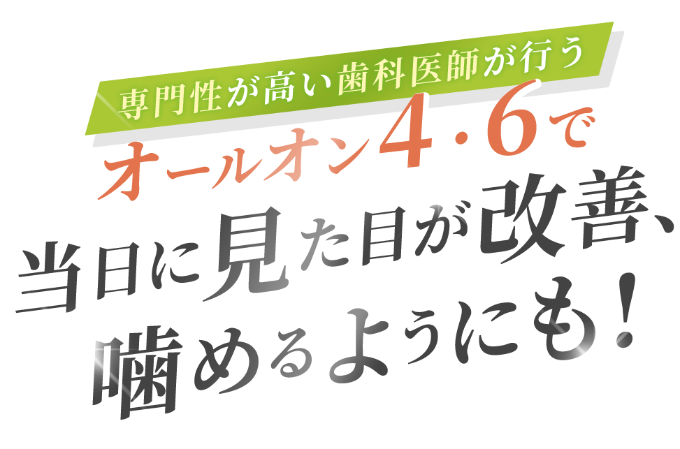 オールオン4・6ではインプラント体を顎骨に打ち込み、入れ歯を装着した当日に食べ物を噛めるようになります。患者さんの状態にもよりますが、術後に麻酔が切れてからであれば、食事をすることができる点はメリットと言えます。