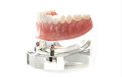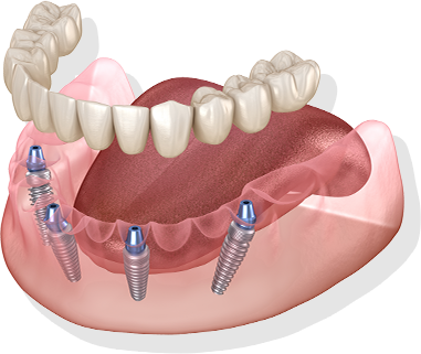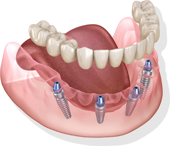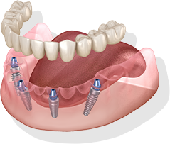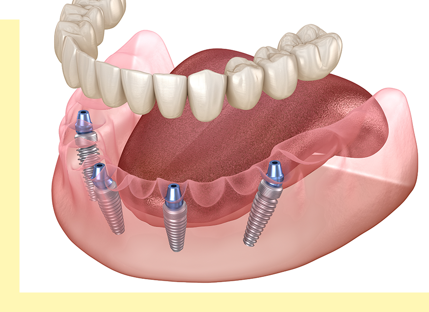 インプラント体を顎骨に埋め込み結合させて、そこへ入れ歯を取り付ける方法をオールオン4やオールオン6と言います。片顎につき最小4本のインプラントを使うことで、入れ歯を固定させることができます。