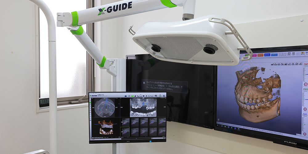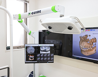 CT撮影で口周りのデータを取得した後、コンピューターに読み込ませて診断や分析を行う設備をエックスガイドと言います。顎骨、神経、血管など口腔まわりの情報を精度高く確認できるため、安全性の高い手術の計画を可能とします。