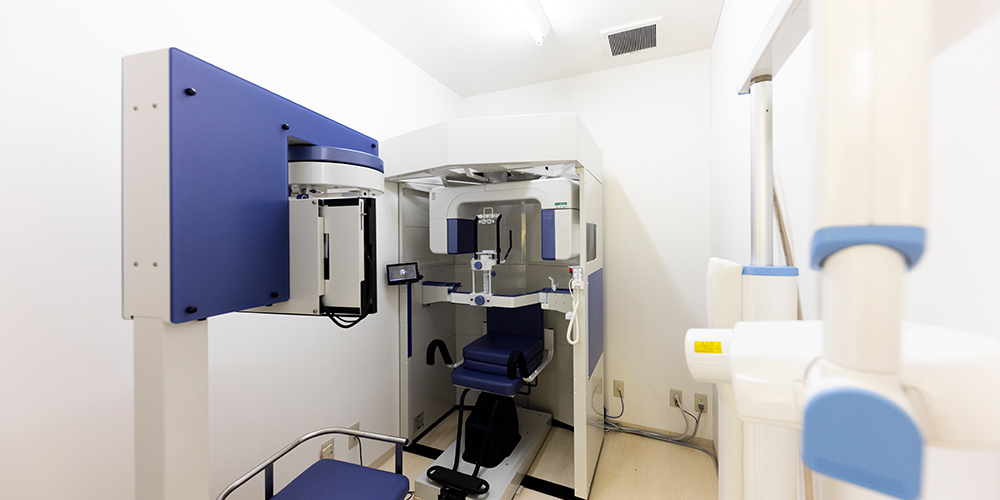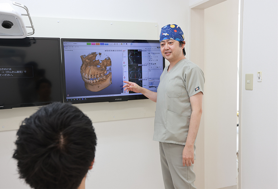 治療を始めるにあたり、まずは口周りの検査を行います。歯科用CTなどの先端機器を使用して、精度高くデータを取得していきます。患者さんの状態を事前にしっかり把握するとともに、治療計画の作成にも役立ちます。